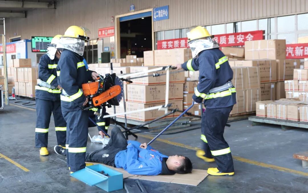 演练以通汇物流北二物流中心员工违规使用充电宝充电导致爆炸引发大火、有人员被困为模拟现场,对信息报告、人员疏散、报警求助、灭火救援、医疗救护等过程进行了应急演练。通汇物流消防应急小组、集团保卫部、职工医院、经开区泾渭消防中队、汉德公司、配件公司等多家单位参与其中。
