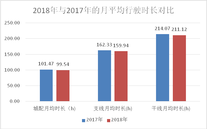 2018年城配运输月平均行驶时长为99.54小时,支线运输月平均行驶时长为159.94小时,干线运输为211.12小时,干线运输分别是城配运输、支线运输的2.1倍和1.3倍。与上年相比,各运输方式月均行驶时长同比降幅分别为1.91%、1.4%和1.38%。