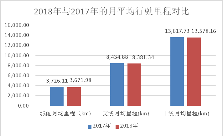 分运输方式看,2018年城配运输月平均行驶里程为3671.98公里,支线运输月平均行驶里程为8381.34公里,干线运输为13578.16公里,干线运输分别是城配运输、支线运输的3.7倍和1.6倍。与上年相比,各运输方式月均行驶里程均小幅下降,同比降幅分别为1.45%、0.63%和0.29%。